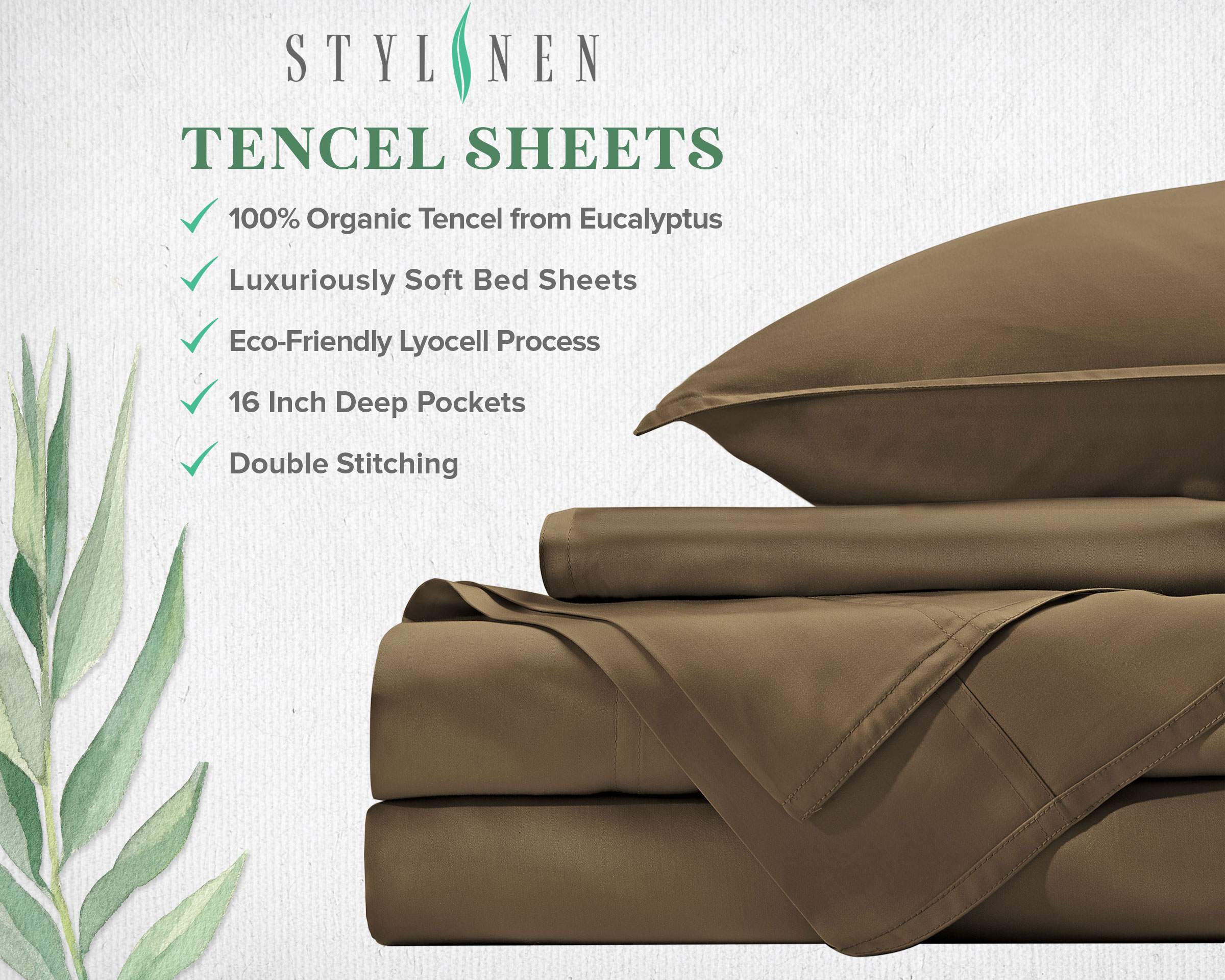 STYLINEN luxury bed sheets are made from the highest quality 100% Tencel Lyocell, a natural wood pulp cellulose from the inner part of the eucalyptus tree. Produced with eco-friendly, recyclable, earth-friendly solvents, STYLINEN bedding is great for those with sensitive skin. Rest assured that you are covered by OEKO-TEX STANDARD 100 CERTIFIED environmental standards.